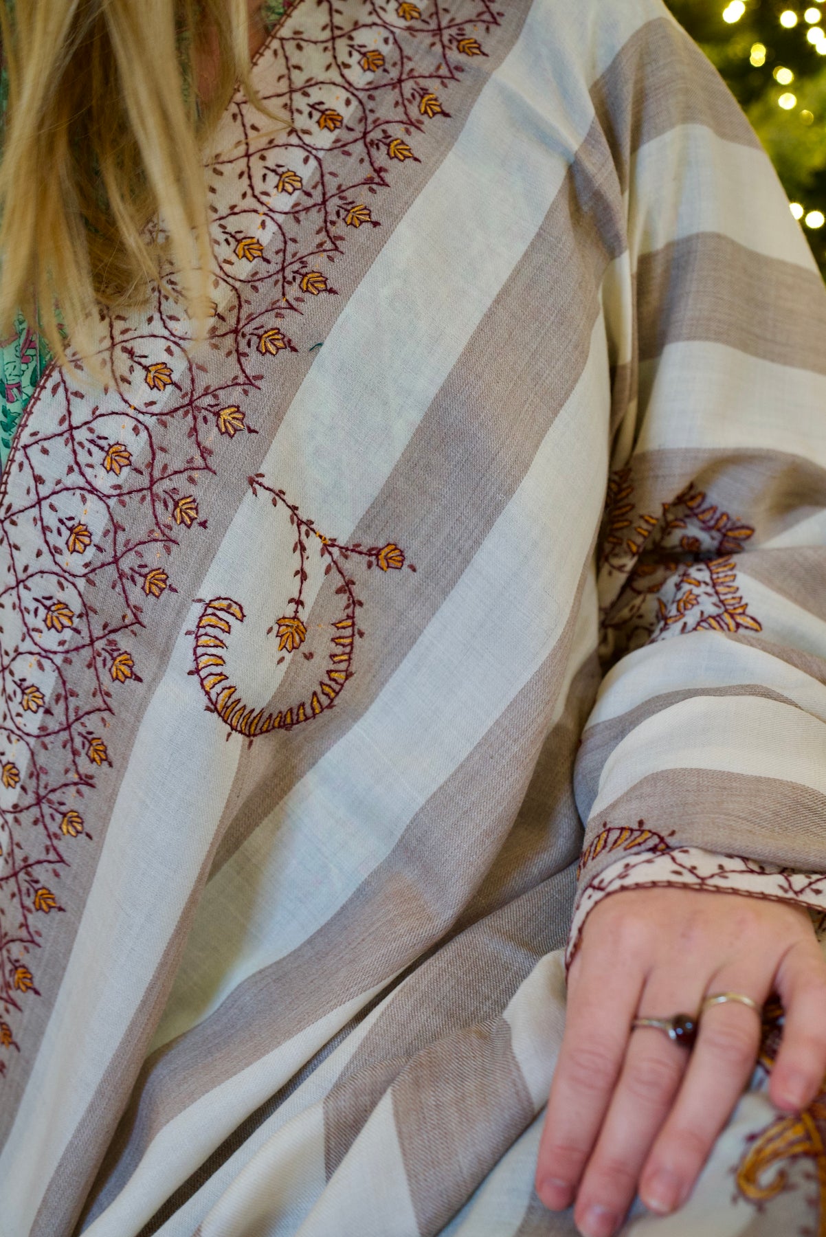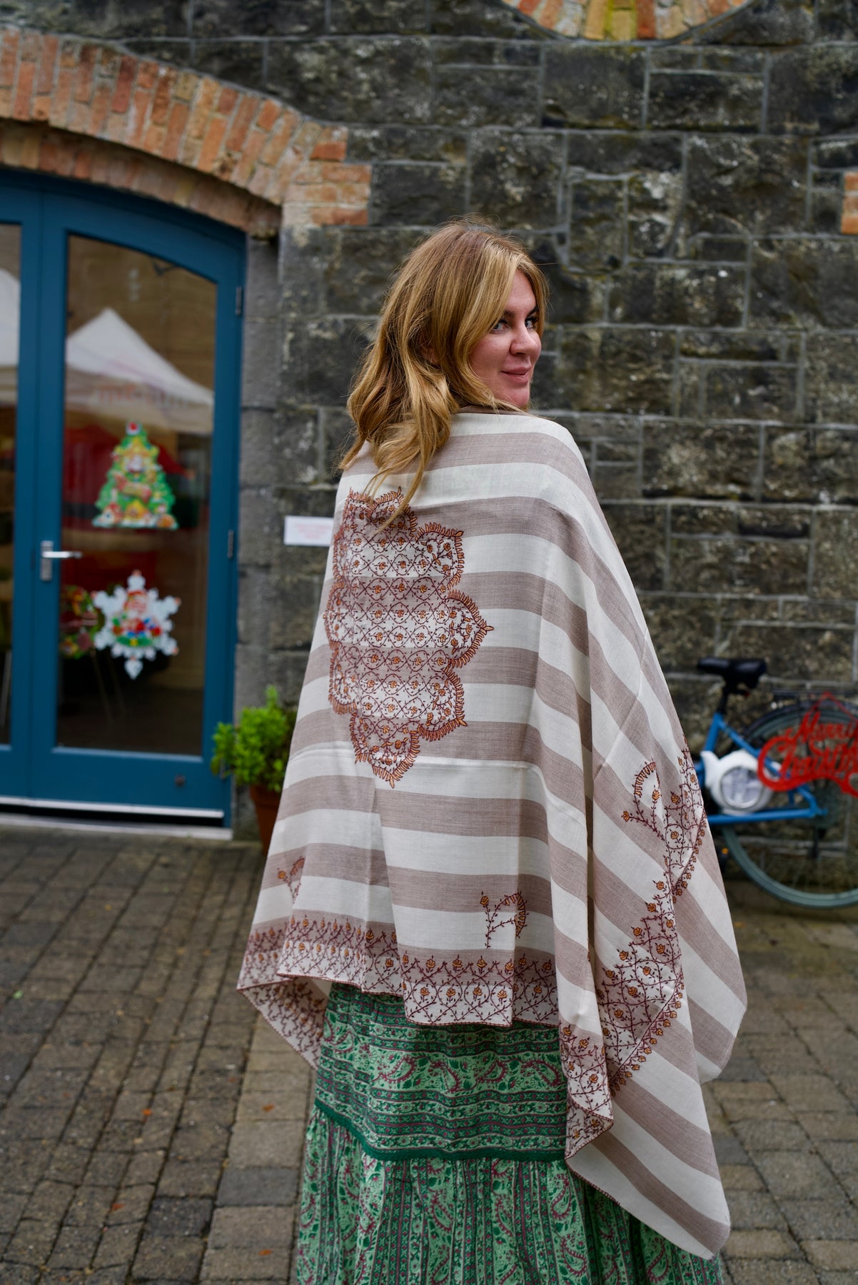 100% wool shawls, adorned with meticolous hand held needle embroidery - timelss pieces or art, created by artisans of Kashmir. We handpicked these shawls ourselves while visiting snowy Kashmir and met the people, who still carry the tradition of this saddly dying art. In the world of fast, here and now these gems stand out, they have a soul, prayers are weaved into them. Warm, timeless, natural.